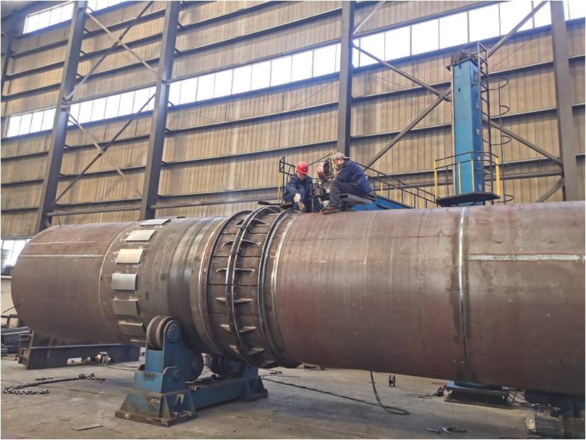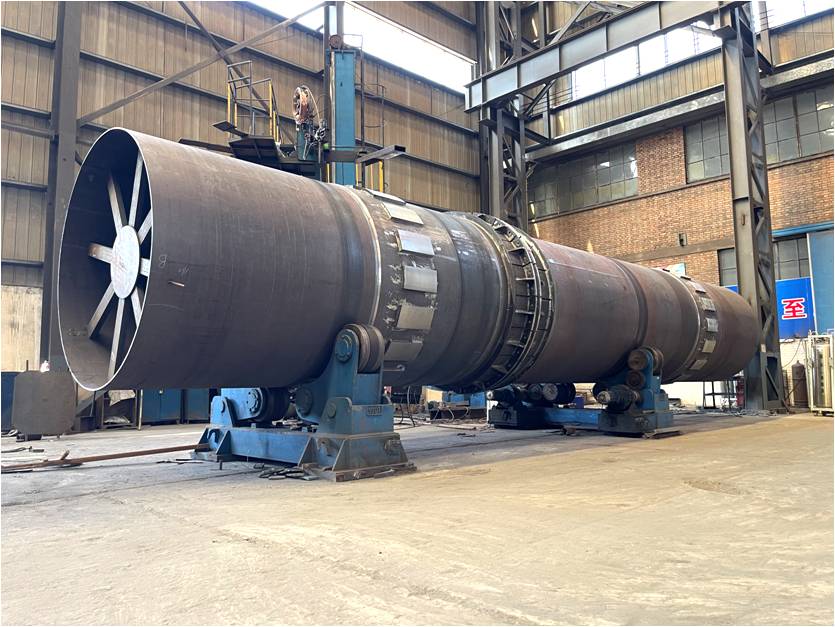 公司重點項目φ2.336×14m冷卻機筒體在成套廠鉚焊車間快速推進(jìn),組對交檢合格后進(jìn)入下道涂裝工序。